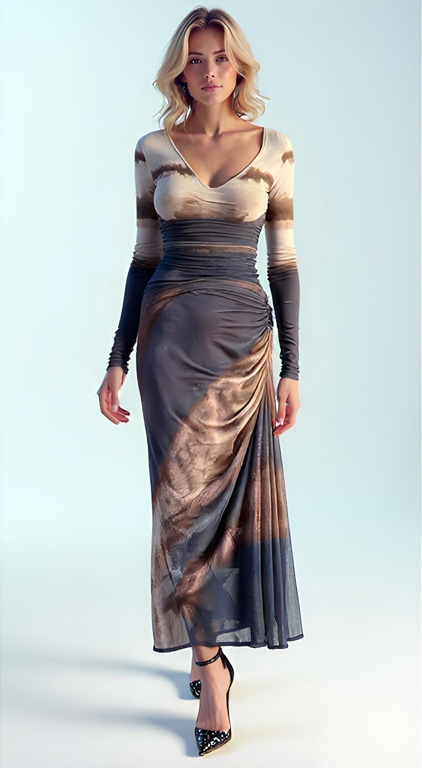 Make a statement with this stunning sheer mesh bodycon maxi dress! Perfect for creating those show-stopping party looks and unforgettable club outfits. This figure-hugging dress features long sleeves and ruched detailing that flatters every curve! Style it as: Club night with heels and accessories, Birthday party outfit, Cocktail event dress, Party ready look